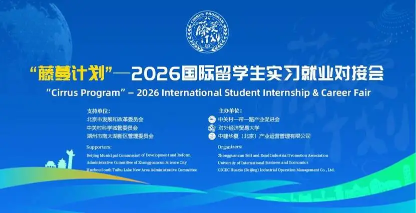 为深入服务一带一路高质量发展,搭建**青年人才交流与校企合作平台,2026年4月10日,藤蔓计划2026**留学生实习就业对接会在对外经济贸易大学**交流大厦顺利举行。本次活动由中关村一带一路产业促进会、对外经济贸易大学、中建华夏北京产业运营管理有限公司共同主办,北京市发改委、中关村科学城管委会、湖州市南太湖新区管委会为活动提供大力支持。活动汇聚政府、高校、企业多方力量,共同助力**留学生在华实习就业,推动人才**化与企业互联网化协同发展。藤蔓计划是面向**